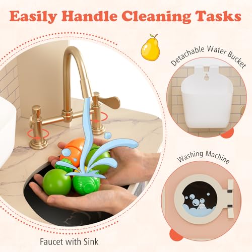 - 【Cleanliness Awareness】Turn everyday chores into enjoyable playtime with a toy faucet and sink, paired with a detachable water bucket for easy “dishwashing.” The included washing machine allows kids to “clean” their kitchen towels and aprons, encouraging responsible habits and providing hours of imaginative cleaning fun.