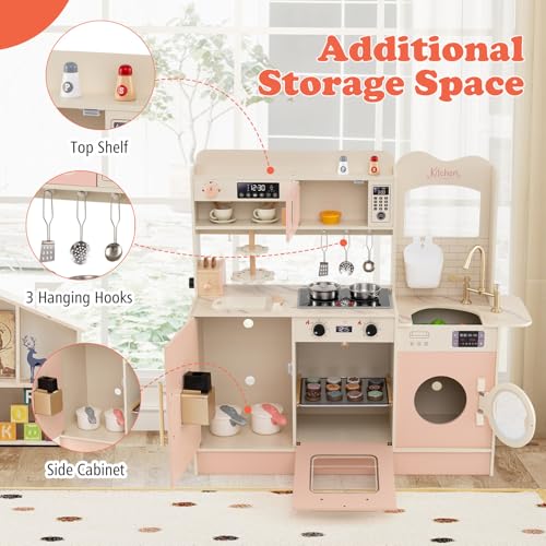 COSTWAY Kids Wooden Kitchen, Pretend Play Kitchen with Light, Sound, Sink & Faucet, Microwave Oven, Coffee Machine, Ice Dispenser, Utensils, Children Chef Role Playset for Boys Girls (Pink)