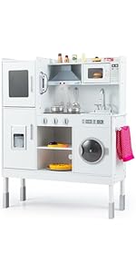 - 【Ample Storage Space】Foster good habits and keep the play area neat with smart storage solutions, including a 2-tier dessert display rack, a top shelf, 3 hanging hooks for utensils, and a side cabinet. Kids will love tidying up the toy kitchen playset – it’s as fun as pretend-cooking!
