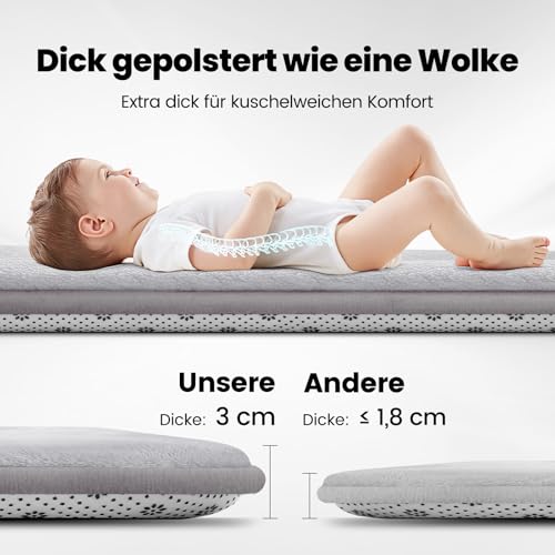 Extra thick foam play mat: Our extra thick foam crawling mat is made of 3 cm thick memory foam and provides your baby with stable yet soft support when playing, crawling and in the prone position. The surface is made of ultra-soft flannel and feels particularly comfortable on the skin. This crawling blanket offers your baby a soft and safe play area and invites them to carefree, unlimited fun.