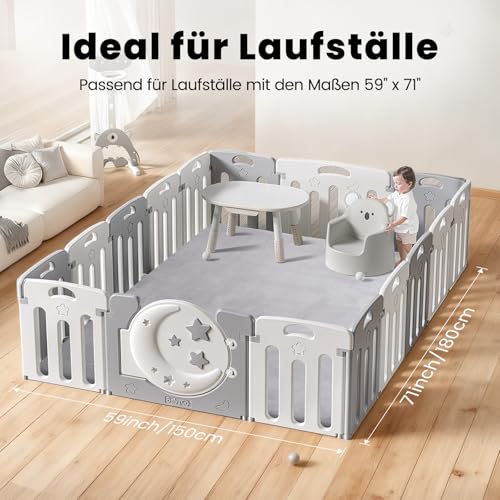 Soft and safe play area: The crawling mat has a non-slip backing that ensures a secure grip on hardwood or tile floors without rolling up or slipping. It measures 150 x 180 x 3 cm and therefore fits perfectly into a 150 x 180 cm playpen. The thick padding protects your baby from bumps and bruises when crawling and learning to walk. Its elegant and minimalist design blends harmoniously into any children's room decor.