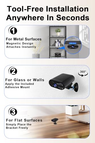 【Quick Installation】Effortlessly install this mini camera in seconds with its magnetic and adhesive mounts. Perfect for securing metal shelves, windows, or walls, this small camera offers ultimate placement versatility for indoor surveillance, and serves as a discreet, hidden monitor for your valuables.