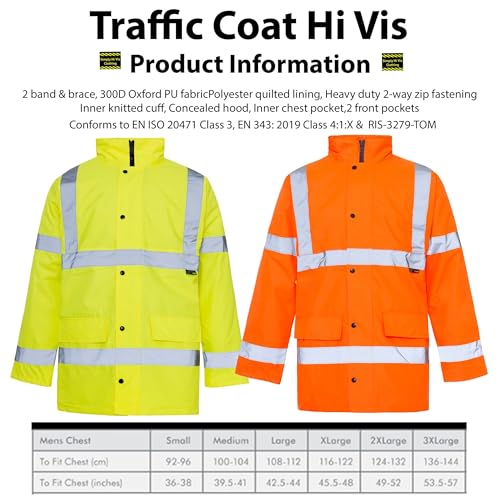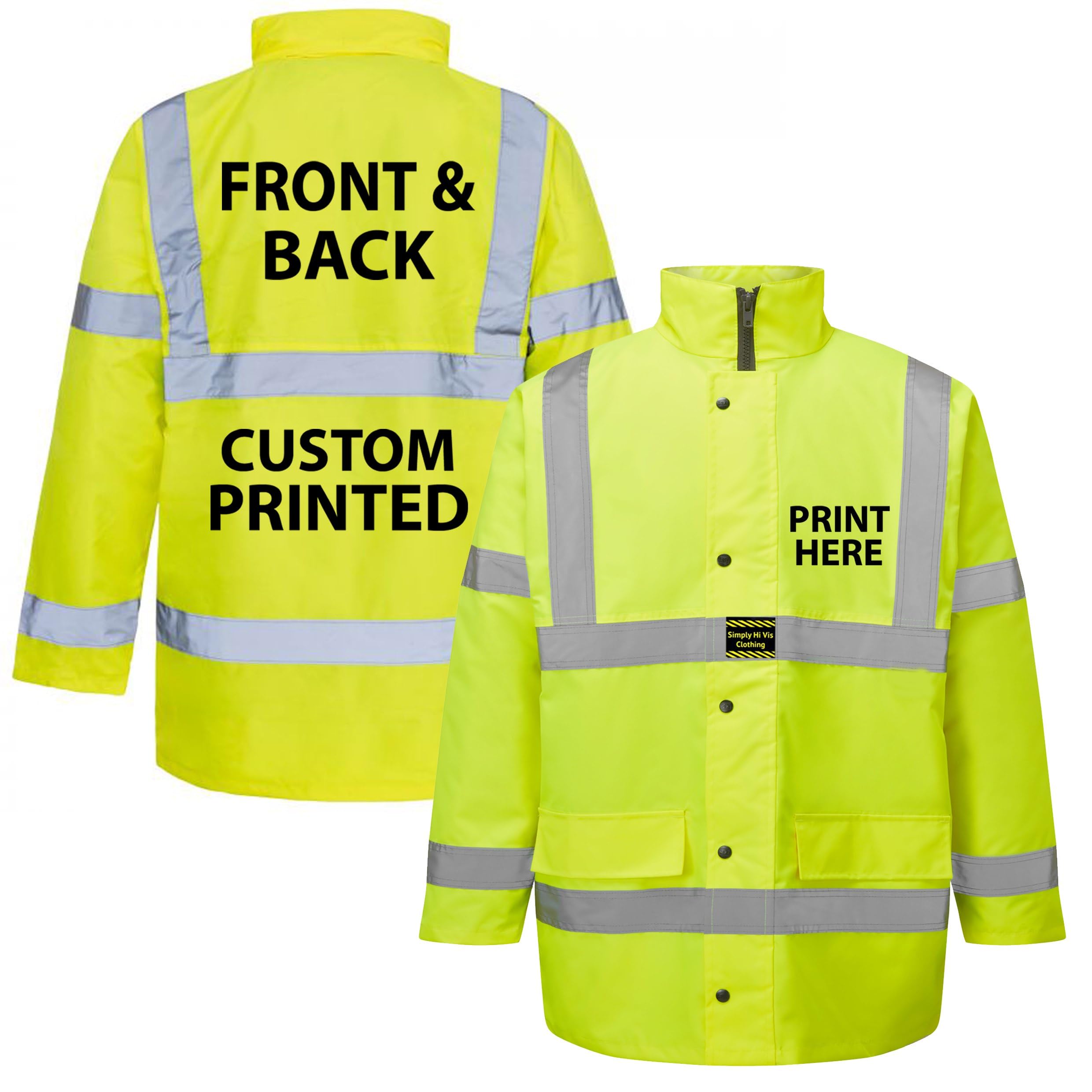 Custom Printed Traffic Jacket Yellow Or Orange Hi-Vis Coat Safety Hi -Viz Visibility Coat – Our hi vis jacket comes in the choice of two colours which are yellow and orange, it includes hivis stripes on both arms, shoulders and around the body making the wearer more visible in poorly lighted environments, thanks to the hivis stripes it allows this jacket to conform to EN ISO 20471:2013 Class 3 Approved, EN 343 Class 3:1 Approved, 89/686/EEC Directive and the orange also conforms to GO/RT 3279 Issue 8, then with the jacket being made with the Outer Fabric 300 Denier 100% Polyester PU Coated and then finished off with waterproof taped seams,includes a hood with drawcord under collar, 1 inner pocket under flap near chest, 1 Inner pocket & 2 outer pockets with studded flap, Padded & Lined, Washable 25X. Class 3, Silver 5cm wide reflective tapes around the body and one over each shoulder, fixing and Certified CE. Supplied by Simply Hi Vis Clothing UK, Bournemouth, Dorset.