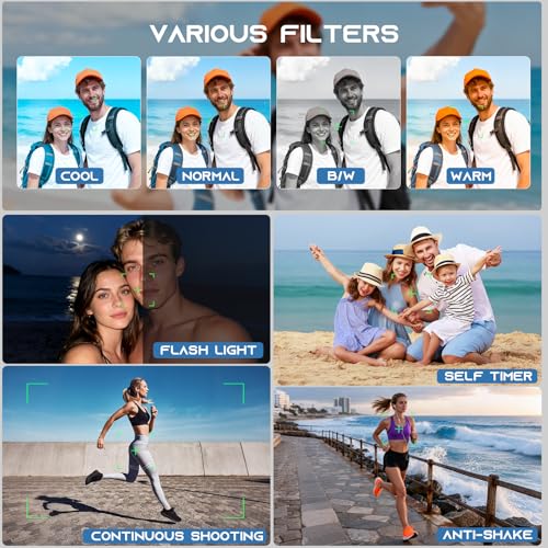 【Multifunctional Camera with Flash】This digital camera comes with multiple filters to inspire creativity and deliver a colorful photography experience—perfect for kids and beginners alike. It also offers a range of practical features: anti-shake technology, timer shooting, beauty mode, and burst mode, helping you create personalized images. Equipped with a built-in microphone, speaker, and fill-in flash, it captures high-quality photos even in low-light conditions