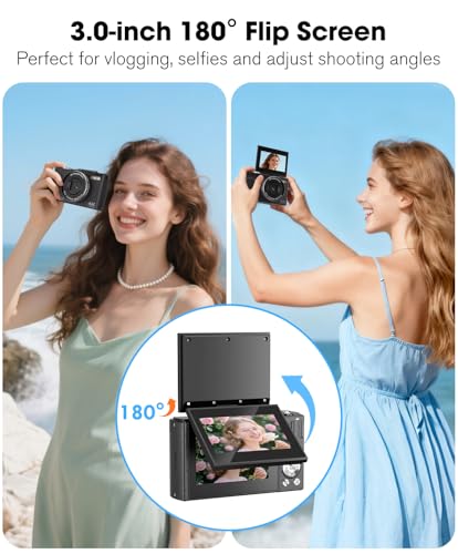 【Autofocus Cameras with 3" 180° Flip Screen】This compact digital camera features a 3-inch IPS HD screen that rotates 180°, making it ideal for selfies and vlogs. The 3.0-inch IPS screen and autofocus system on this camera for photography ensure you effortlessly capture every key moment. Simply press the shutter button once to focus, then press it again to capture the shot with this vintage camera.