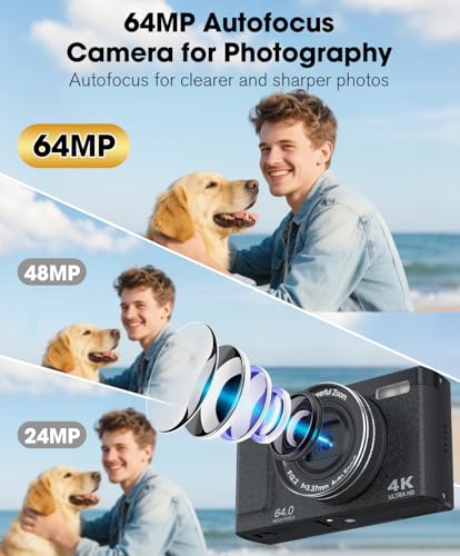 Digital Camera, 4K 64MP Autofocus Compact Photo Camera, 3