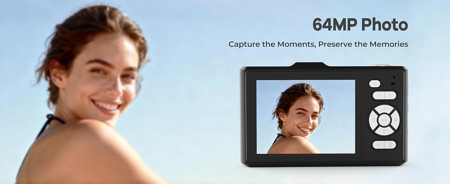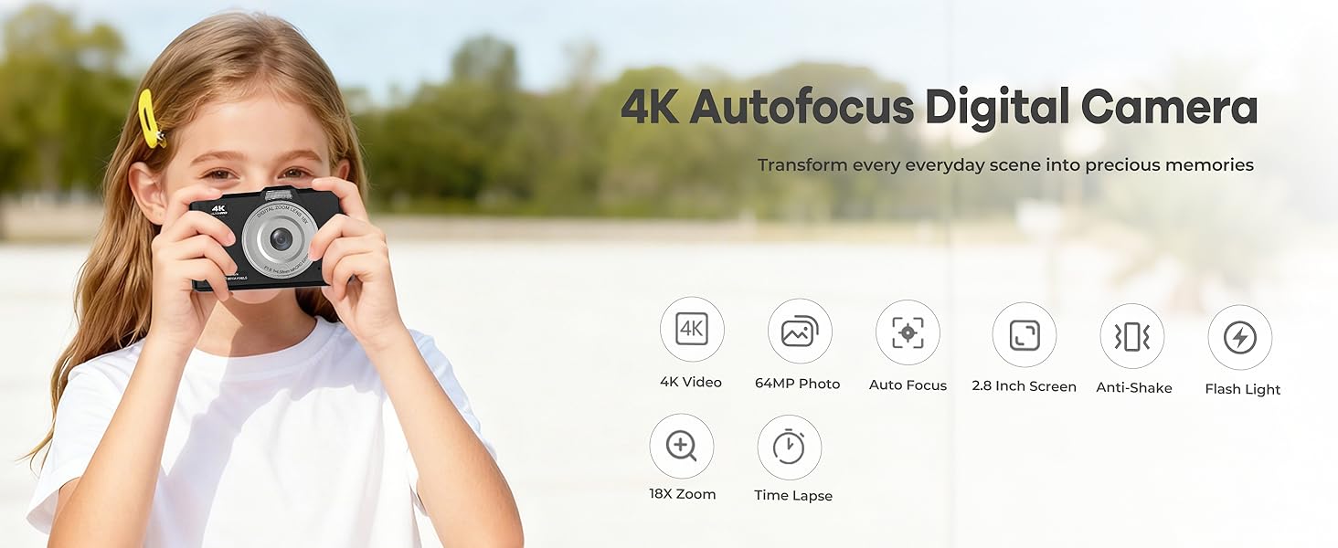Unleash Your Creativity in 4K & 64MP: This digital camera turns your life's moments into ultra-sharp photos and videos. Perfect for beginners and kids, the Anti-Shake mode guarantees crisp, blur-free shots every time, making photography fun and frustration-free!
