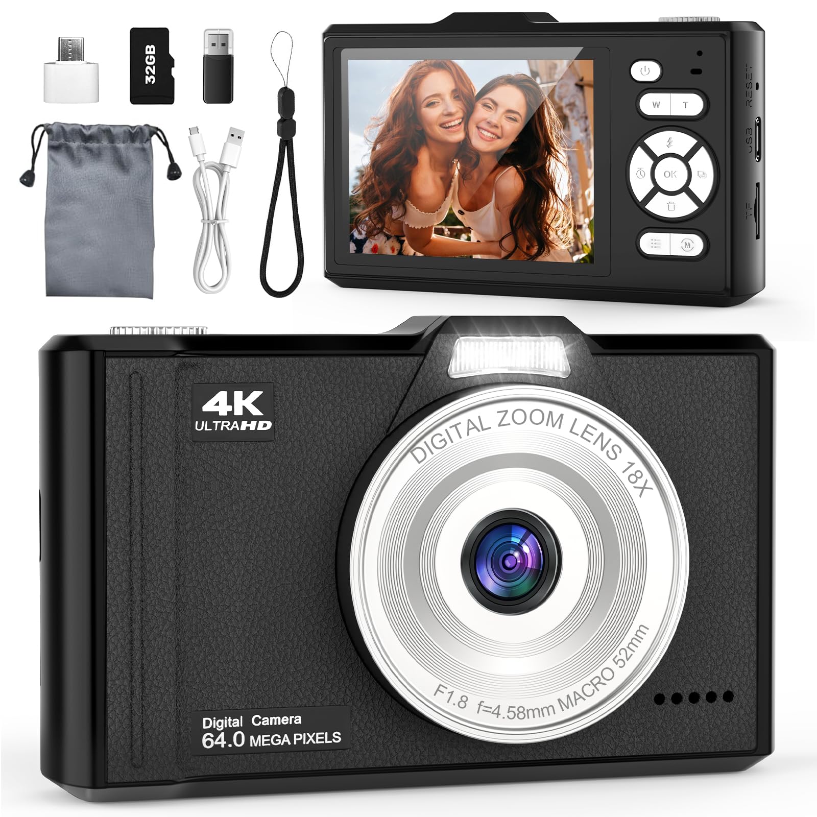 Digital Camera 4K 64MP Compact Portable Photo Camera,18X Digital Zoom Autofocus | Anti-Shake,2.8″ IPS Screen with 32GB SD Card & OTG Adapter,Vlogging Camera for Kids Teens Beginners Students