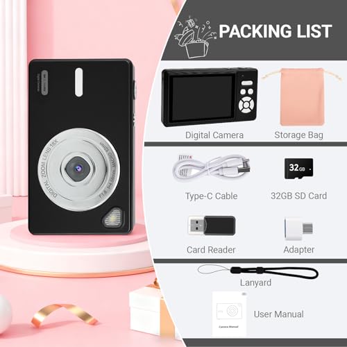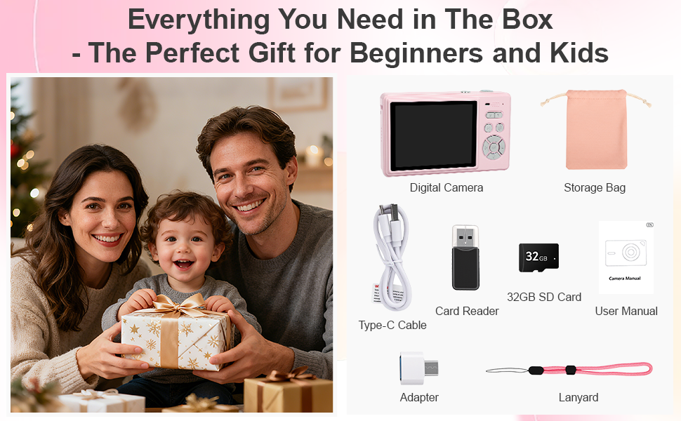 Complete Kit & Ideal Gift: Comes with a 32GB SD card, card reader, USB-C cable, adapter, wrist strap, storage bag, and user manual. Ready for birthdays, trips, concerts, or vlogging—no experience needed. Just aim and shoot. A great gift for kids, teens, seniors, and beginners on holidays or special occasions.