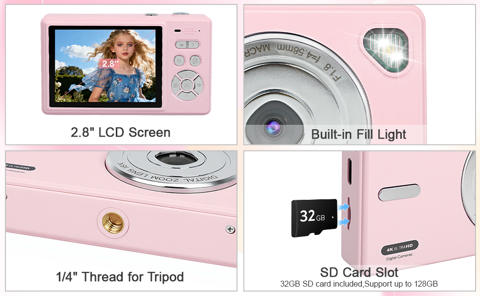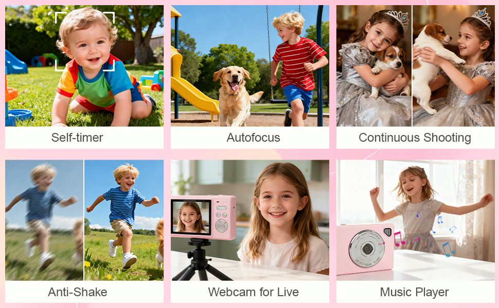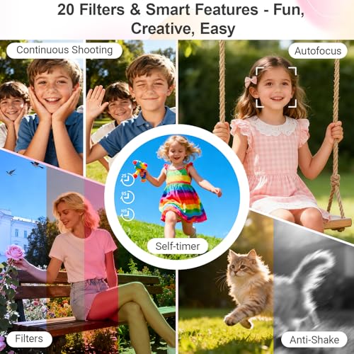 Portable Multifunction Camera: This digital camera is very light and can be carried anywhere in your pocket, easy to use and ideal for beginners, children and teenagers. This childrens digital camera is equipped with 20 filters, anti-shaking, self-timer, fill light, continuous shooting, date stamp, time-lapse recording, smile capture, internal microphone and speaker (recording sound videos). Perfect for your daily photography needs