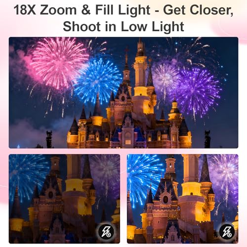 18X Digital Zoom & Flash Light: This compact camera supports 18x digital zoom. You can zoom in or out on the subject by pressing the W/T button while recording videos and taking still photos to zoom in or out on distant objects and capture all the details you need. And the kids digital camera built-in fill light helps you take high-quality pictures in the dark. The pause function allows you to pause recording or playing videos