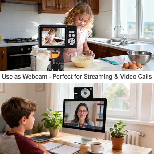 Large Screen & Webcam Function: Features a 2.8" LCD display for easy framing and playback. The included rechargeable battery supports extended recording when fully charged. It also works as a webcam: simply connect to a computer via USB to enable live streaming or video calls. Share your content directly to social platforms like YouTube or Facebook.