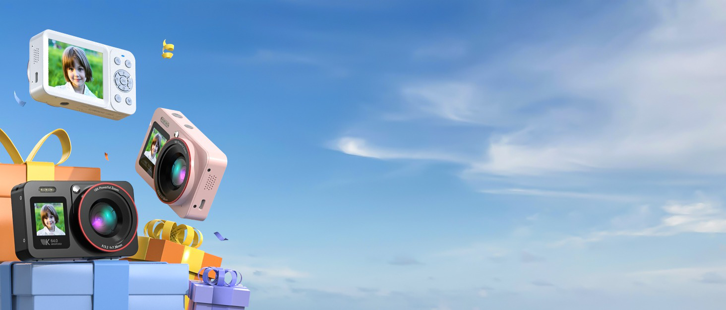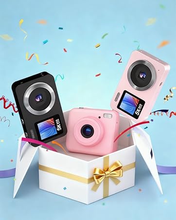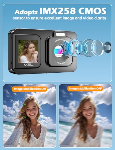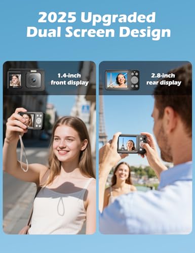 - ️Dual Screens & Built-in Anti-Shake: Say goodbye to awkward angles and shaky footage! This digital camera is designed with dual front and rear screens(2.8'' rear screen + 1.4'' front screen), making it easy to frame the perfect selfie or vlog shot every time. Whether you're capturing moments solo or filming on the go, the built-in anti-shake technology ensures your photos and videos stay sharp and stable — even while moving.