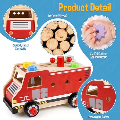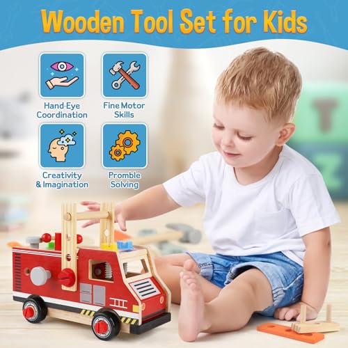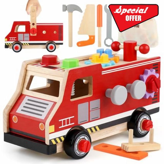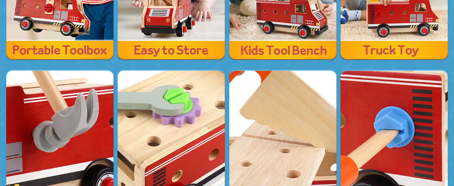 【Multi-Purpose Kids Tool Box】Kids tool boxs based on fire trucks can be used as kids tool bench, toy trucks, storage boxes and suitcases. When you place the lid on the truck compartment, it becomes a kids tool bench. When the handle is installed, it turns into a suitcase for your child to carry. Multiple ways to play to immerse your child in construction games.