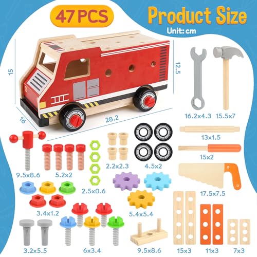 【Wooden Kids Tool Set 47 Pcs】The toy tool set is designed and manufactured according to the Montessori educational method. Bright colours and a variety of ways to play allow children to learn practical life skills while playing with kids tools such as screwdrivers and wrenches, bringing them joy and confidence. 3 year old boy toys.