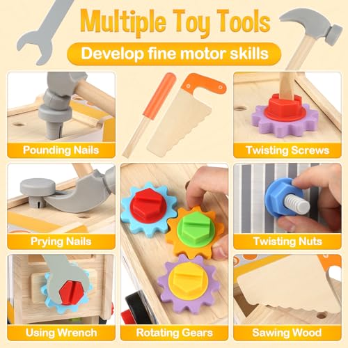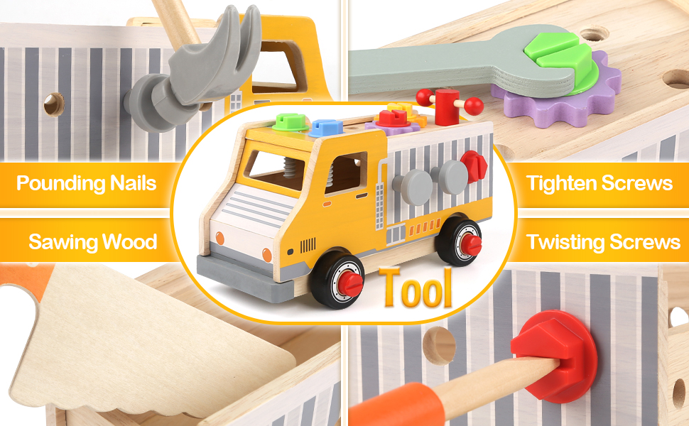 【Educational Toys】Our toy tool set are easy to assemble and disassemble. Kids can learn to screw with a screwdriver, hammer nails, use a spanner, saw wood and play with gears. Tools for kids can work on their co-operation and promote motor skills during play. Montessori toys for 3 year olds.