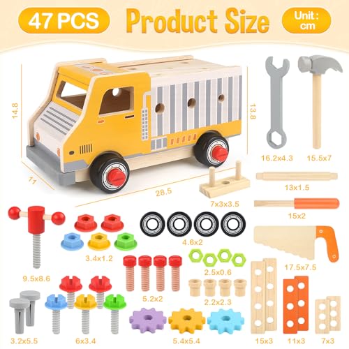 【47 Pcs Wooden Kids Tool Set】The toy tool set is designed and manufactured according to the Montessori educational method. Bright colours and a variety of ways to play allow children to learn practical life skills while playing with kids tools such as screwdrivers and wrenches, bringing them joy and confidence. 2 year old boy toys.