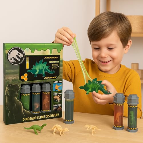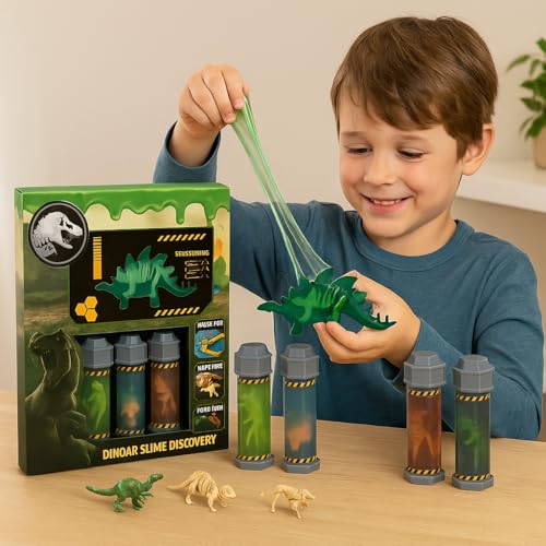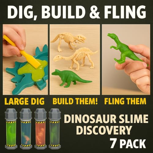 - 7 Complete Discovery Tubes – Each contains slime and a hidden dinosaur surprise! Dig, Build & Play – Excavate fossils, assemble dinosaurs, and let the imaginative adventures begin. STEM Educational Fun – Encourages hands-on learning, curiosity, fine motor skills, and early science exploration. Safe, Non-Toxic Slime – Squishy, stretchy, sensory fun that’s kid-friendly. Perfect Gift for Kids – Ideal for boys and girls ages 5–12 who love dinosaurs and creative play.