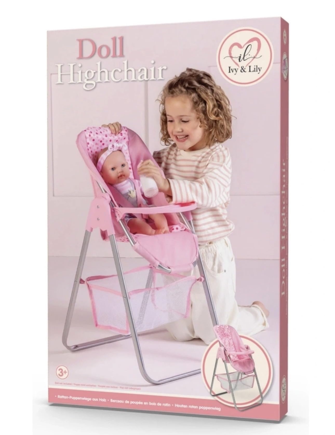 Doll High Chair, Foldable Metal Frame with Storage Basket, Pink: 40x33x67cm, Age 3+