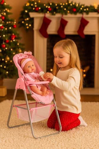 Delight your little one with this charming doll’s high chair, perfect for nurturing their imaginative play. The high chair features a lovely pink colour scheme with an adorable polka dot print pattern that adds a sweet, playful touch. Designed to accommodate dolls up to 45cm in height, this sturdy high chair measures 40cm in length, 33cm in width, and stands 67cm tall. The durable metal frame provides excellent stability, while the pink fabric seat and feeding tray ensure your child’s beloved doll sits comfortably and securely. A convenient mesh storage basket beneath the seat offers space for doll accessories. The high chair’s practical folding design makes it easy to store when playtime is over. The removable tray and easy-to-clean materials make this high chair a practical choice for hours of pretend mealtime fun. Suitable for children aged 3 years and above, this high chair is an enchanting addition to any doll play collection. Make your little one’s playtime extra special with this cute and stylish Dolls High Chair Spot Print. This high chair is perfect for dolls up to 45cm in height and comes in a lovely pink colour. The chair has been designed with a pram style and is suitable for ages 3 and up. It is a great addition to your doll’s wardrobe and perfect for imaginative play. The chair’s dimensions are 40L x 33W x 67H cm, making it the perfect size for your doll’s needs. Features Foldable doll high chair with a fun polka dot print Large mesh storage basket and folding design With an adjustable padded seat and straps Fits dolls up to 45cm Dolls sold separately Contents: 1x Doll Highchair in Pink Spot Print Dimensions: 40L x 33W x 67H cm Assembly Required: Yes Warning: SMALL PARTS – CHOKING HAZARD. Not suitable for children under 3 years