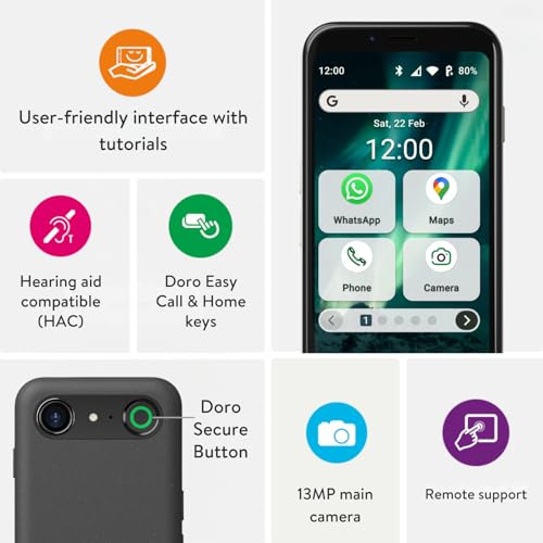 - PRACTICAL FEATURES: Compatible with hearing aids (HAC), this easy-to-use mobile phone features Doro ClearSound technology for clear calls. It is also equipped with a 13MP camera and a user-friendly interface