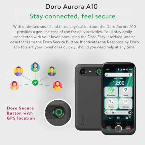 - SIMPLE AND SECURE SENIOR PHONE: Easy to use, the Doro Aurora A10 smartphone is ideal for elderly users. It combines a large screen, practical buttons, clear sound, and an SOS button to offer peace of mind every day.