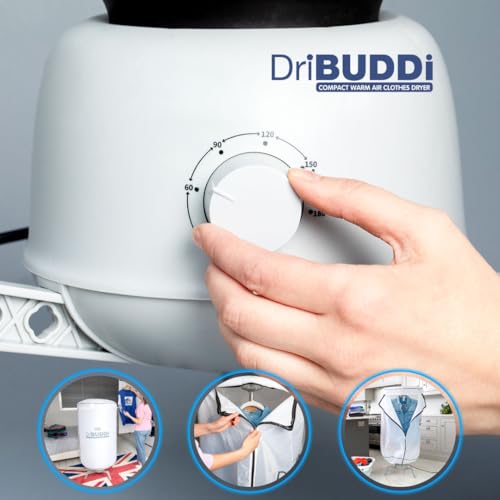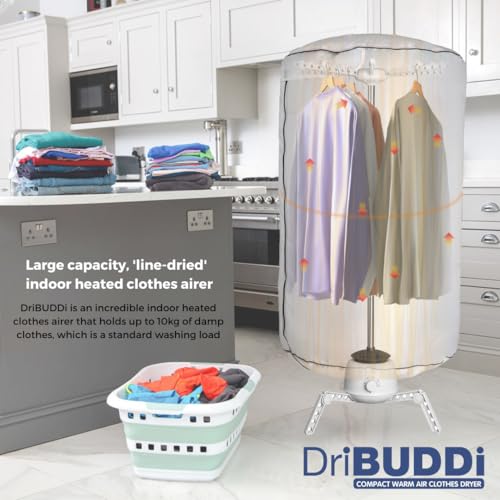 The DriBUDDi Compact is the ultimate solution for drying clothes indoors, offering an efficient and safe alternative to traditional tumble dryers. This electric, portable clothes dryer is designed to simplify your laundry routine, allowing you to dry your clothes quickly and hassle-free, regardless of the weather outside. Its improved, compact design is 30% more efficient than the original model, which translates into lower energy consumption and savings on your bills. Equipped with a powerful 850W heating element, the DriBUDDi Compact generates a gentle flow of warm air that envelops your garments, drying them evenly and naturally. This gentle drying technique not only protects your fabrics from damage, but also minimises wrinkles and shrinkage, significantly reducing ironing time. With a generous capacity of up to 10 kg of wet laundry, it is ideal for family loads or for drying several items at once. Versatility is one of its main advantages. Its compact design with folding legs makes it incredibly easy to set up in any corner of your home and store away when you don’t need it, taking up very little space. Simply hang your clothes, close the protective cover and let the DriBUDDi do the rest. It’s a practical, quiet and safe way to get dry, fresh clothes, just as if you had hung them out in the sun.