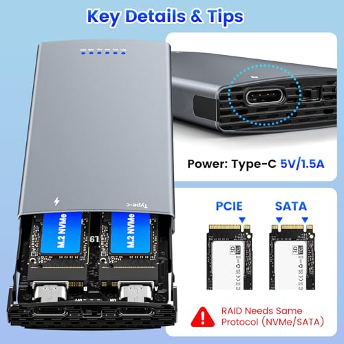 - [Compatibility] This dual-bay M.2 RAID enclosure is compatible with 2230/2242/2260/2280 size PCIe NVMe M-Key/B+M Key M.2 SSDs (M.2 SATA B Key SSDs are not supported).