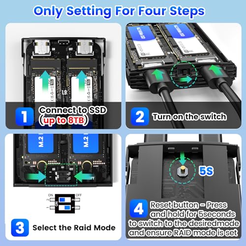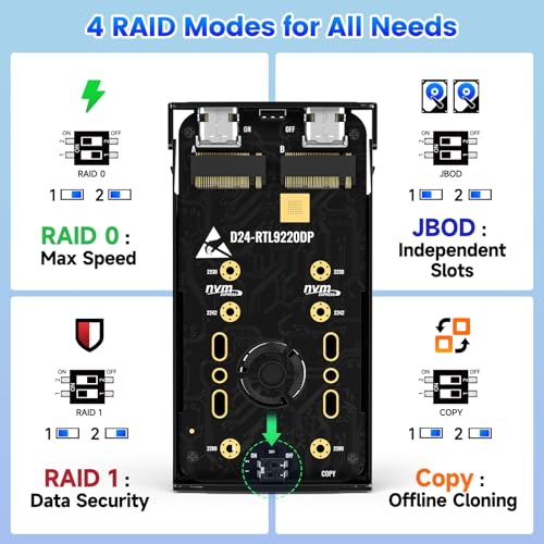 - [4 RAID Modes] This NVMe M.2 RAID enclosure supports RAID 0, RAID 1, PM (Span), and JBOD modes. You can easily switch between drive configurations using the raid mode switch. (Note: Please back up your data before configuring RAID modes to prevent the loss of important data.)