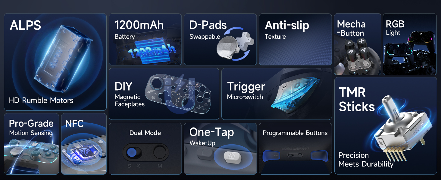 TMR Sticks & HD Rumble & Mecha Button & Mirco Trigger & 2 Programmable Back ButtonsMultifunctionalone Tap Wake up & Motion Sensing & NFC function & RGB Lighting