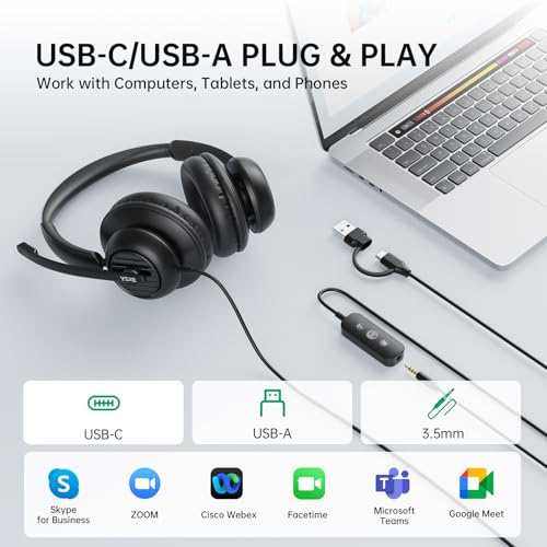 EKSA H8 USB Headset with Microphone for PC Laptop, Computer Headphones with Mic Noise Cancelling, Stereo Sound, In-Line Controls, 3.5mm/USB A/USB C Wired Over-Ear Headphones for Office Teams Home