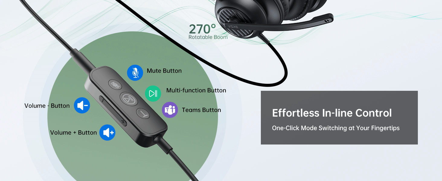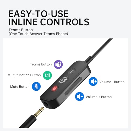 【In Line Controls】Take full control with this pc headset with microphone—instantly answer or end calls, adjust volume, or mute your microphone directly from the inline control. A dedicated Teams button gives you quick access to Teams calls. Just plug into any USB port for a stable, hassle-free connection, perfect for daily work or professional environments.