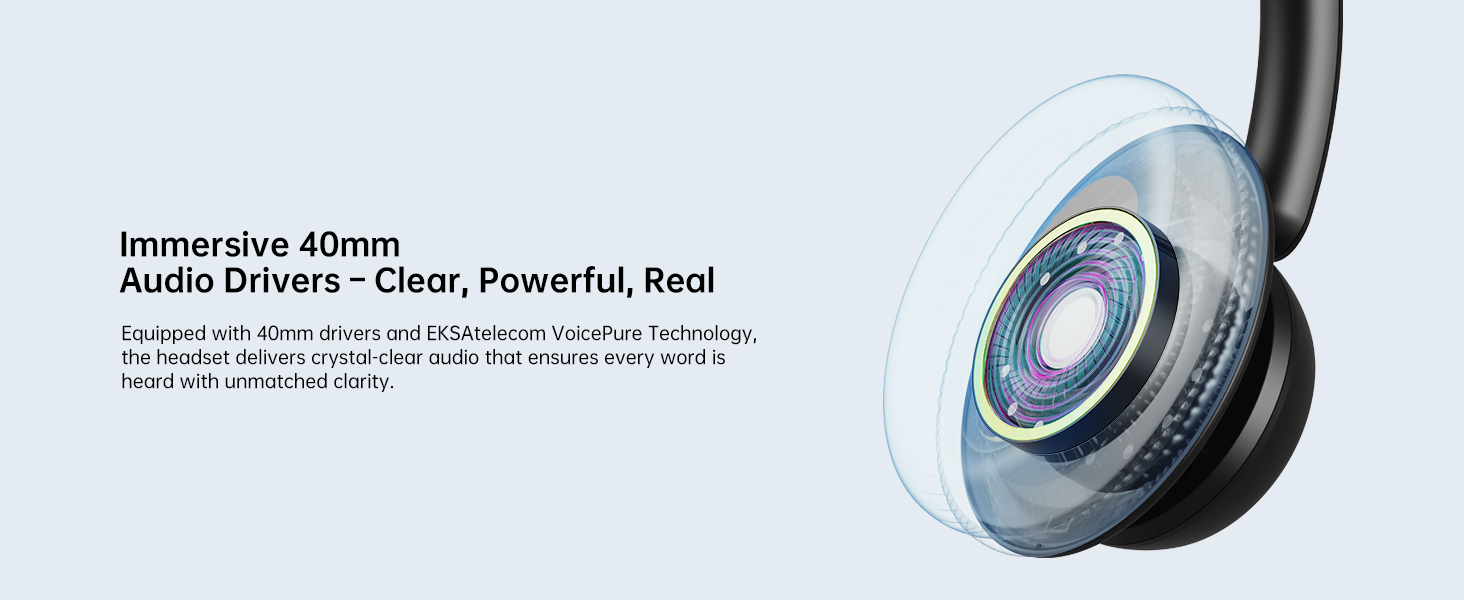 【Crystal-Clear HD Sound】 Engineered for both calls and music, this USB headset is equipped with 40mm large drivers that deliverfull-range, distortion-free sound. EKSAtelecom VoicePure Technology with ENC noise reduction suppresses up to 99.8% of environmental noise, and the 270° adjustable boom mic ensures every word is captured with precision and clarity.