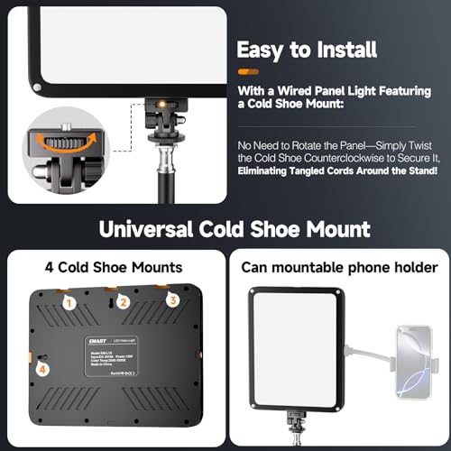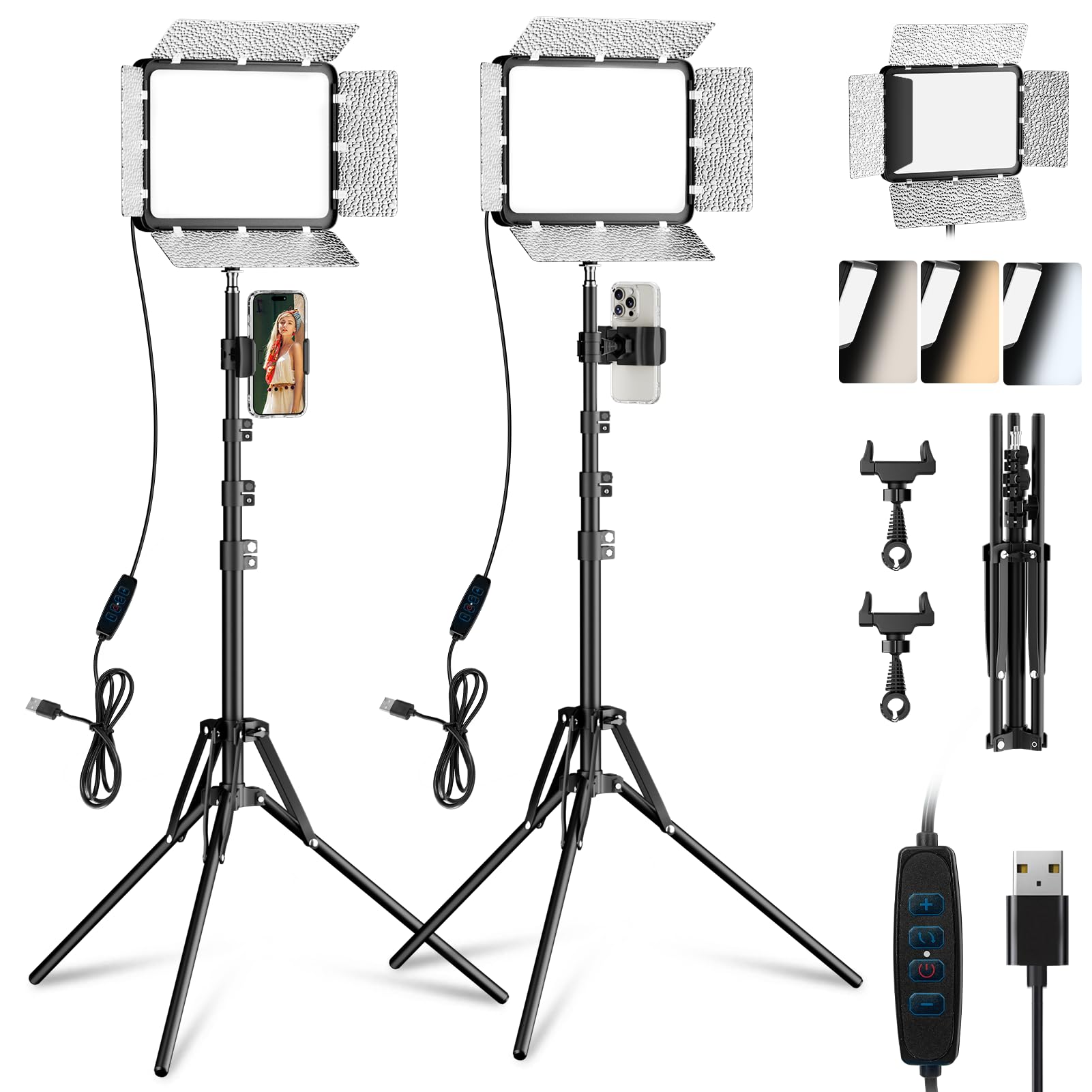 [Package Contents]: Includes 2 led panels, 2 tripods, 2 USB cables (195cm), 1 manual, 2 sets of diffusers & phone mounts. Panels have 4 cold shoe mounts and 2 1/4-inch threaded mounts for connecting photography accessories, suitable as camera lights for photography