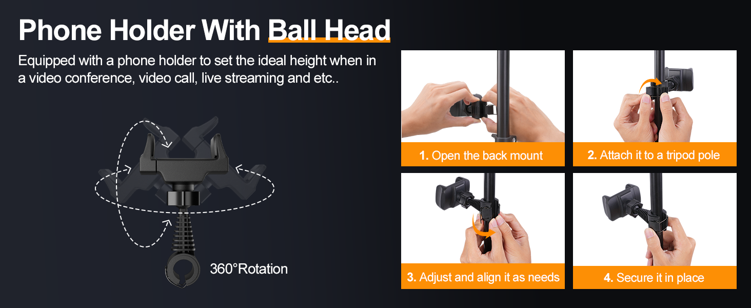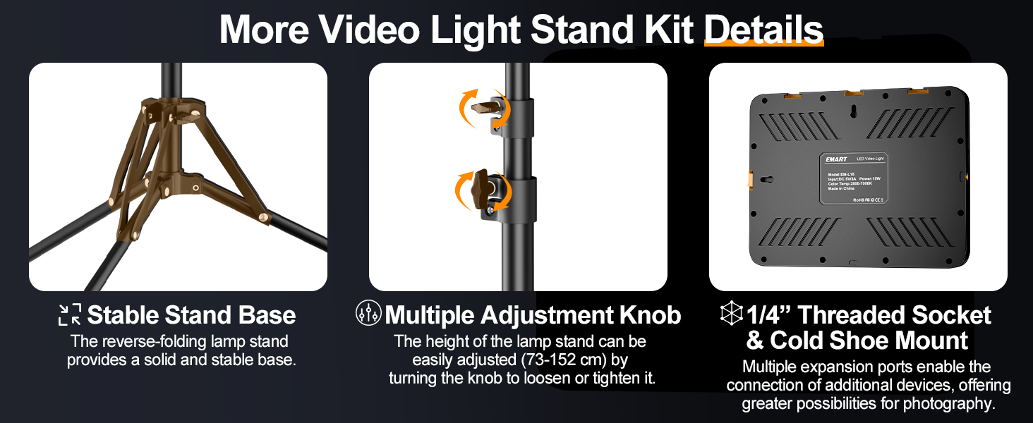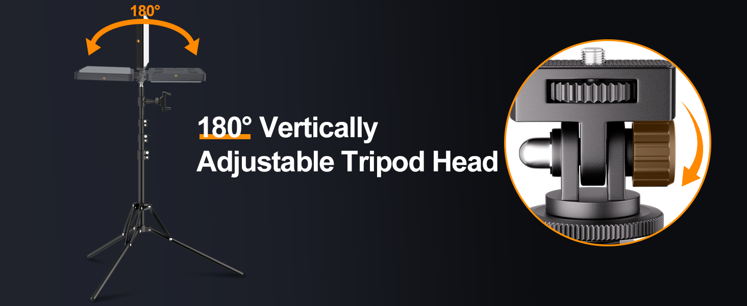 [Multi-Function Tripod]: Reverse-folding tripod with 180° tilt and 1/4-inch quick-release screw. 3 knobs adjust height (73-152 cm) for overhead, low-angle or tabletop use, folds compact for portability—serves as a reliable tripod light and lighting stand for podcasting or live streaming