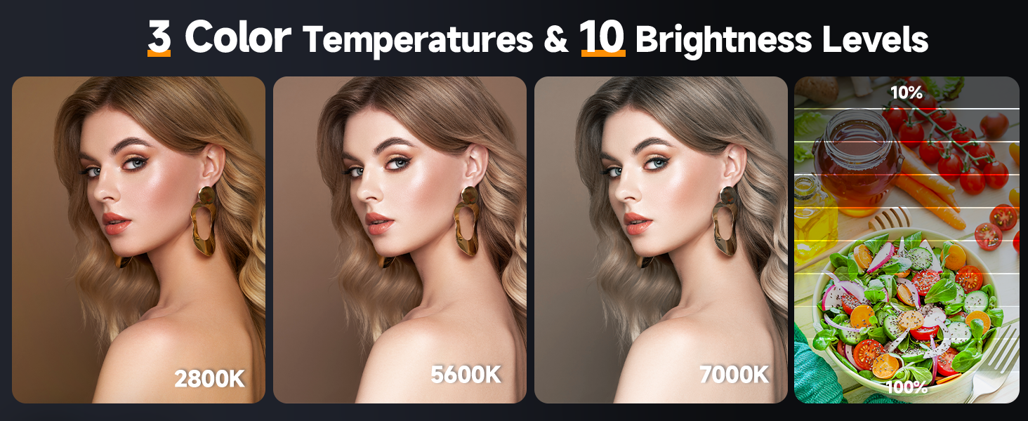 [Temp&Bright Adjust]: Features 3 color temps (2800K-7000K) and 10 brightness levels. 352 LEDs (15W) emit soft natural light (CRI 95+) for true color rendering, eliminating shadows—ideal as a practical led light panel and photo light for portraits, makeup or product shots