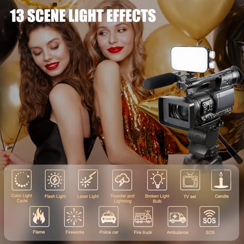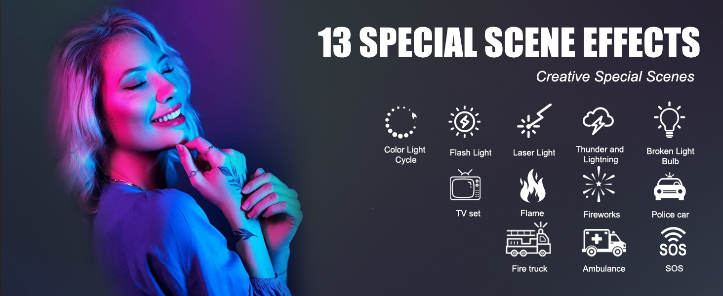 [13 Scene Modes]: 13 scene modes (colour light cycle, strobe, laser colour lights, lightning, flickering bulb, television, candlelight, flame, fireworks, police car, ambulance, fire engine, SOS emergency) cater to diverse photography needs, making it an essential tool for content creators, streamers, influencers, make-up artists, and photography enthusiasts. For optimal illumination, position it near the subject (within 6 feet/2 metres)
