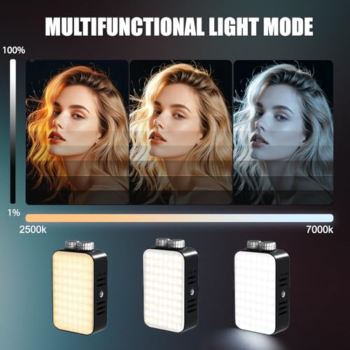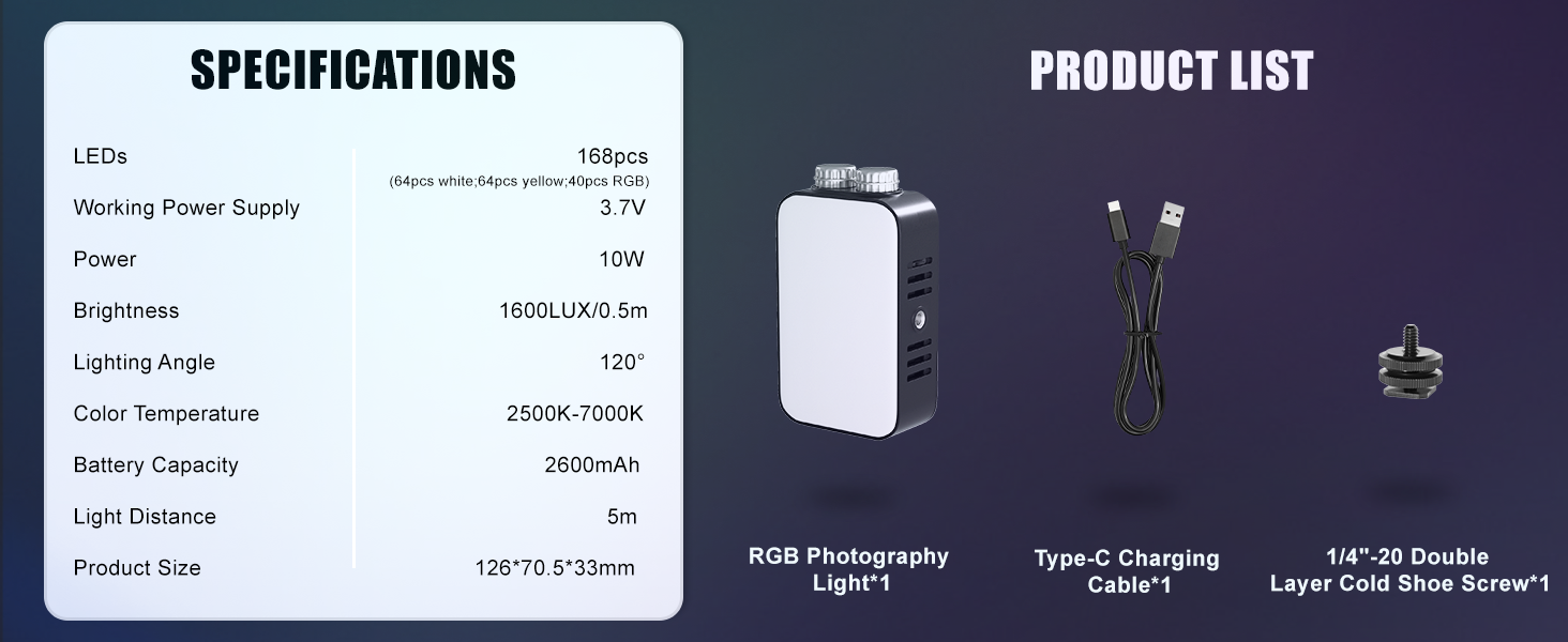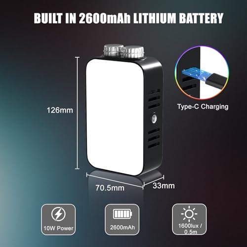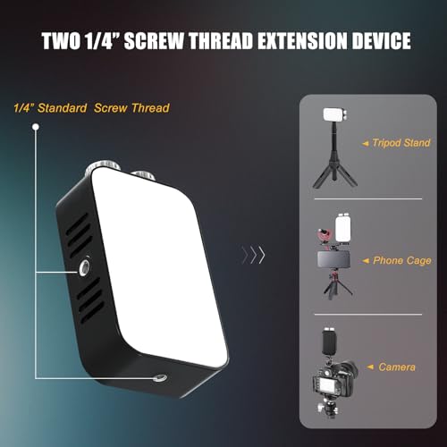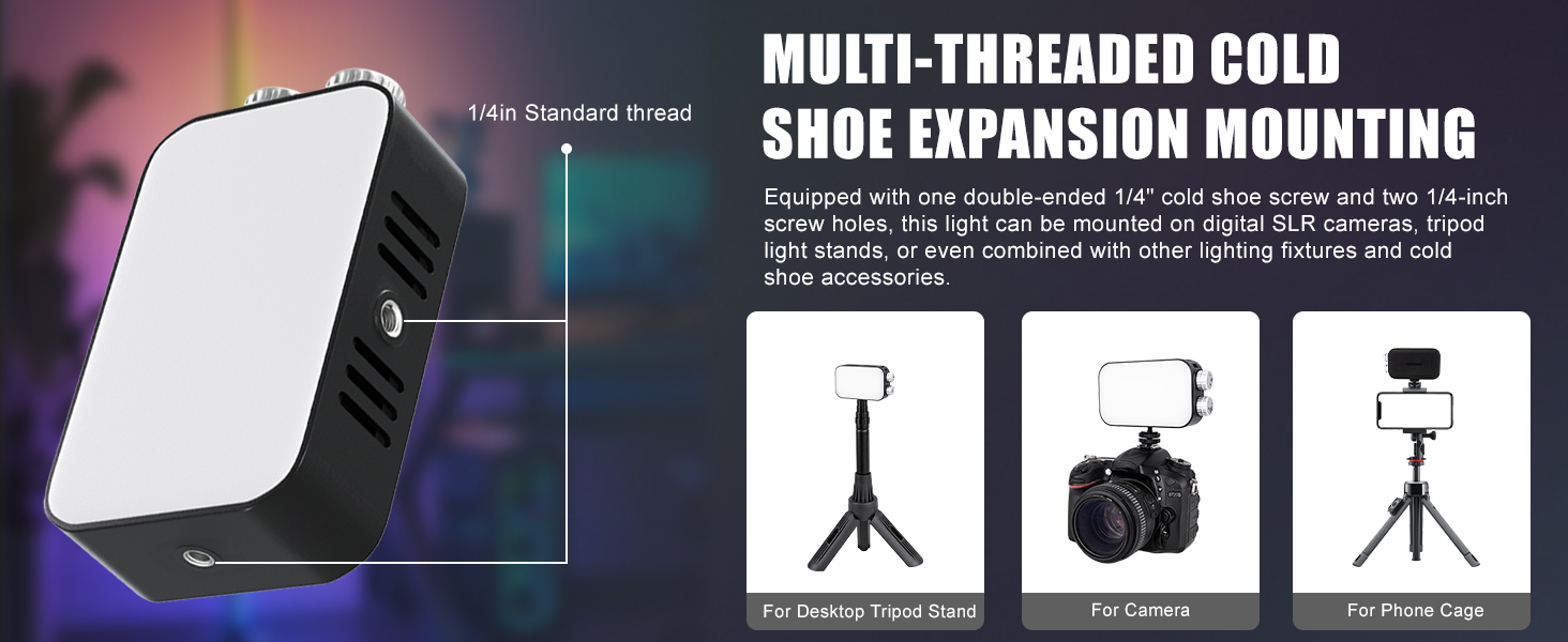 [Portable & lightweight]: Measuring just 126 × 70 × 53mm, this video light fits effortlessly into a rucksack or pocket for hassle-free carrying. Featuring a 1/4-inch threaded mount and dual 1/4-inch cold shoe screws, it seamlessly integrates with various filming equipment such as cameras, tripods, and mobile phone cage systems