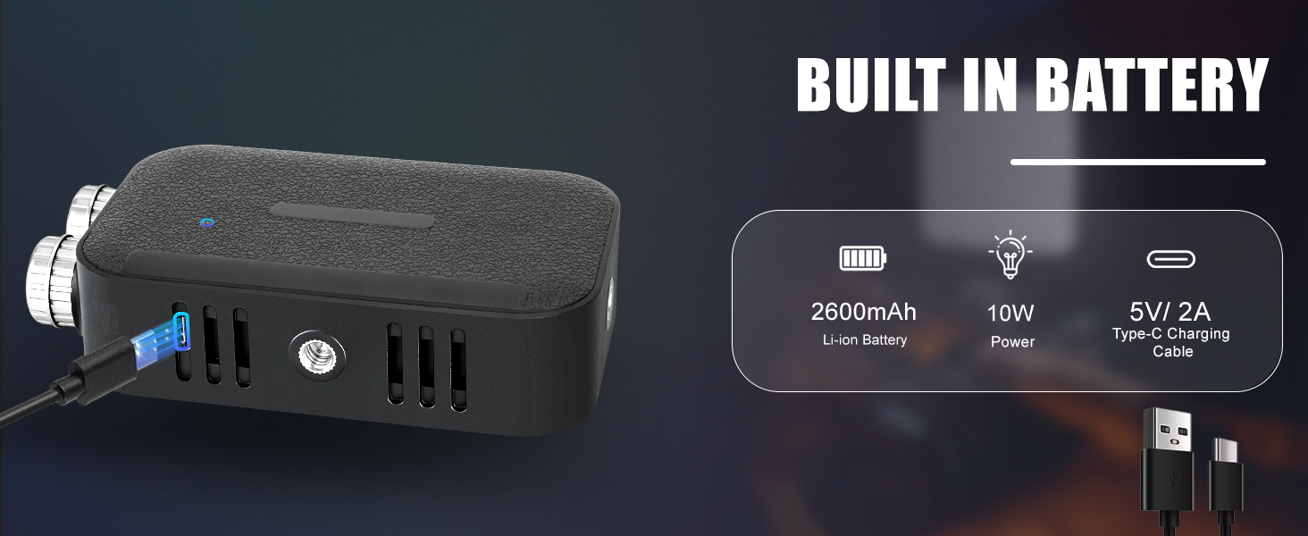 [Rechargeable LED Portable Light]: Features a built-in 2600mAh rechargeable battery for use anytime, anywhere. When fully charged, it provides 2 hours of continuous operation at 100% brightness. Charge via USB Type-C or micro USB ports using a 5V/1A power adapter, power bank, or computer. Note: To prolong battery life, ensure the device is fully charged before first use