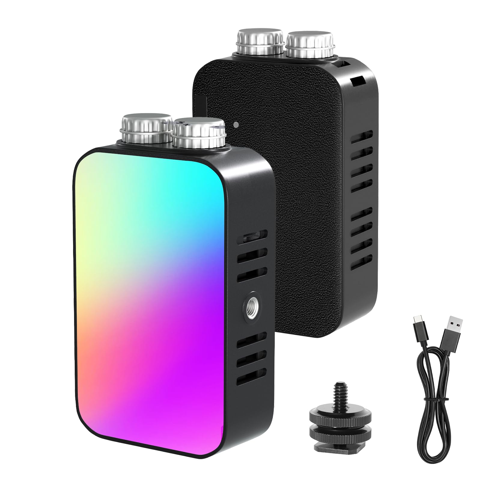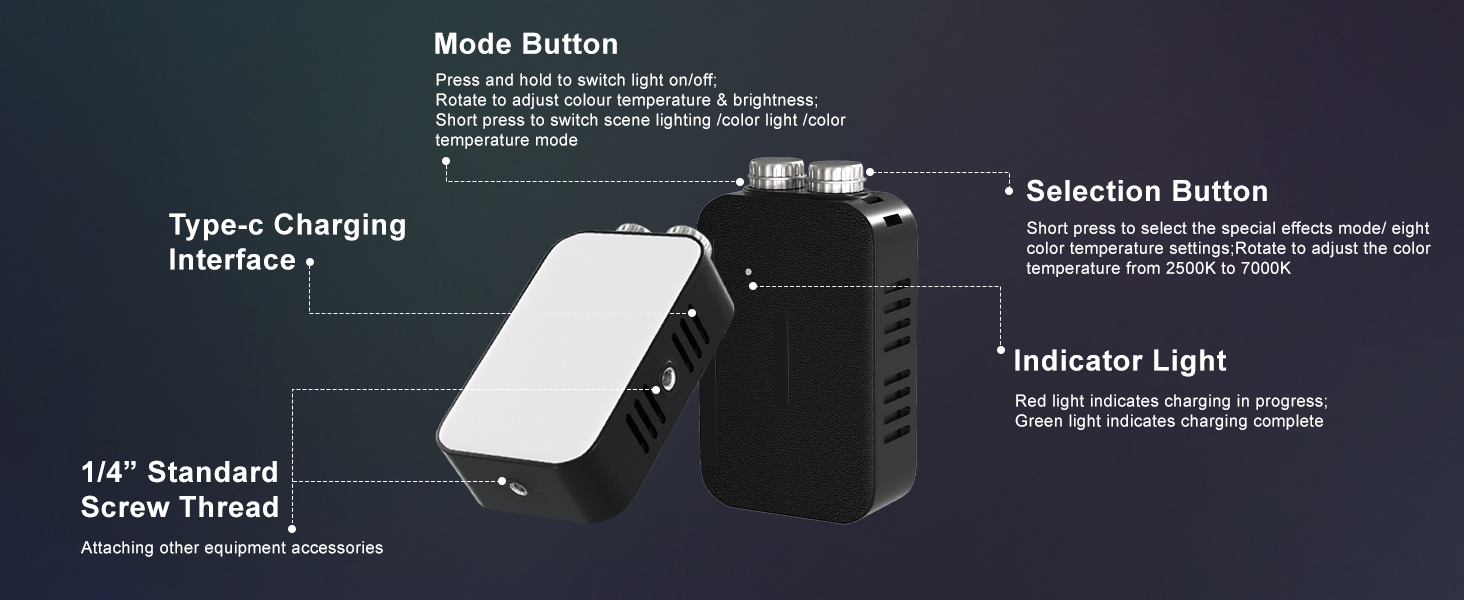 [Multi-scenario Compatibility]: Ultra-wide colour temperature, multi-level brightness, and versatile scene modes with full-colour RGB effortlessly create diverse shooting atmospheres. Ideal for live streaming fill lighting, makeup application, portrait/macro photography, and video recording. Even photography novices can achieve professional-grade results with ease. Package contents: Light unit x1, Type-C charging cable x1, 1/4" dual-head cold shoe screw x1, instruction manual x1