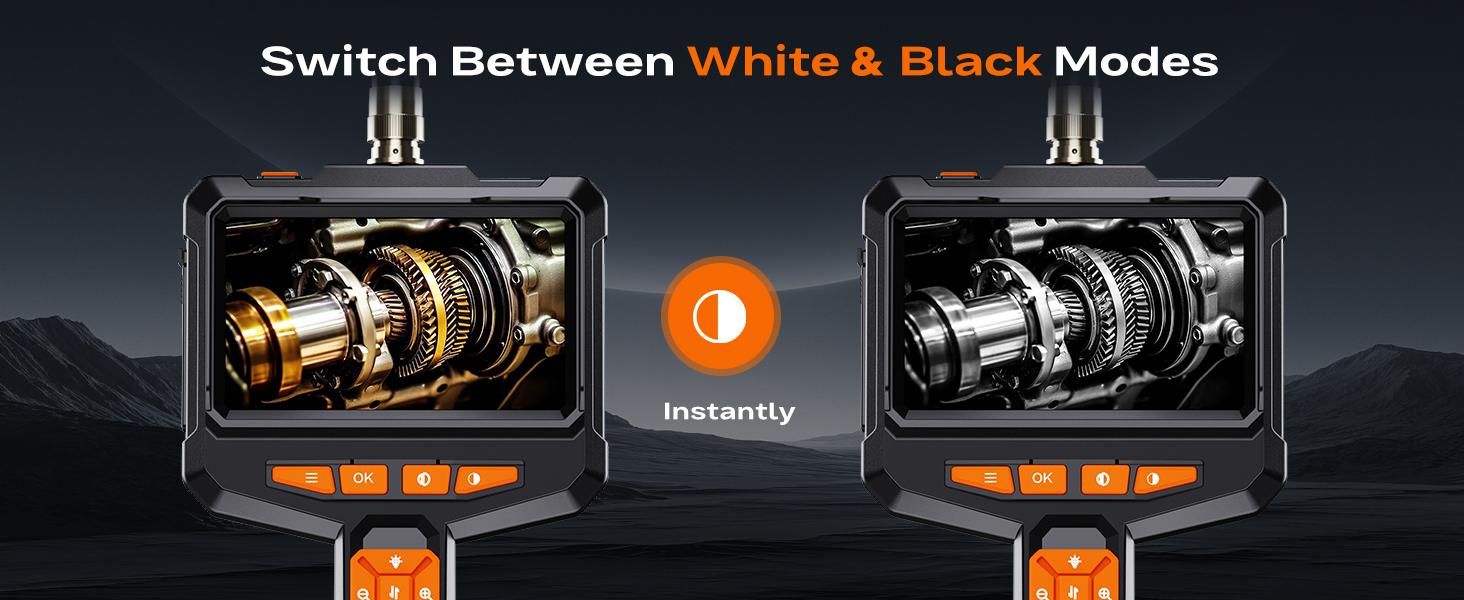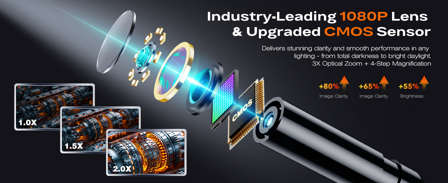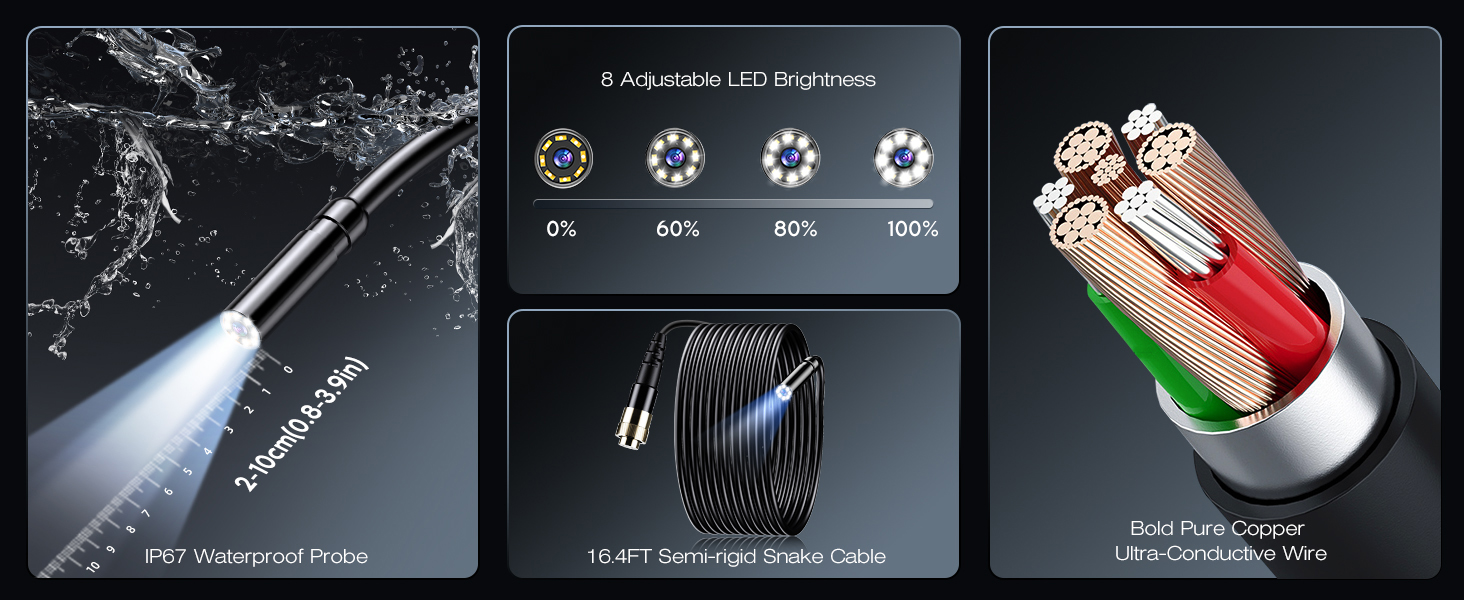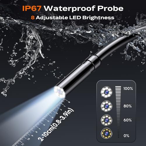 【Endoscope Camera with Built-in Light】 Get a proper look into dark spaces with this endoscope! It features 8 adjustable LEDs and an ultra-thin 7.9mm lens to fit into the tightest spots. A quick press of the button changes the brightness, so you can see every detail, no matter how dark it is.