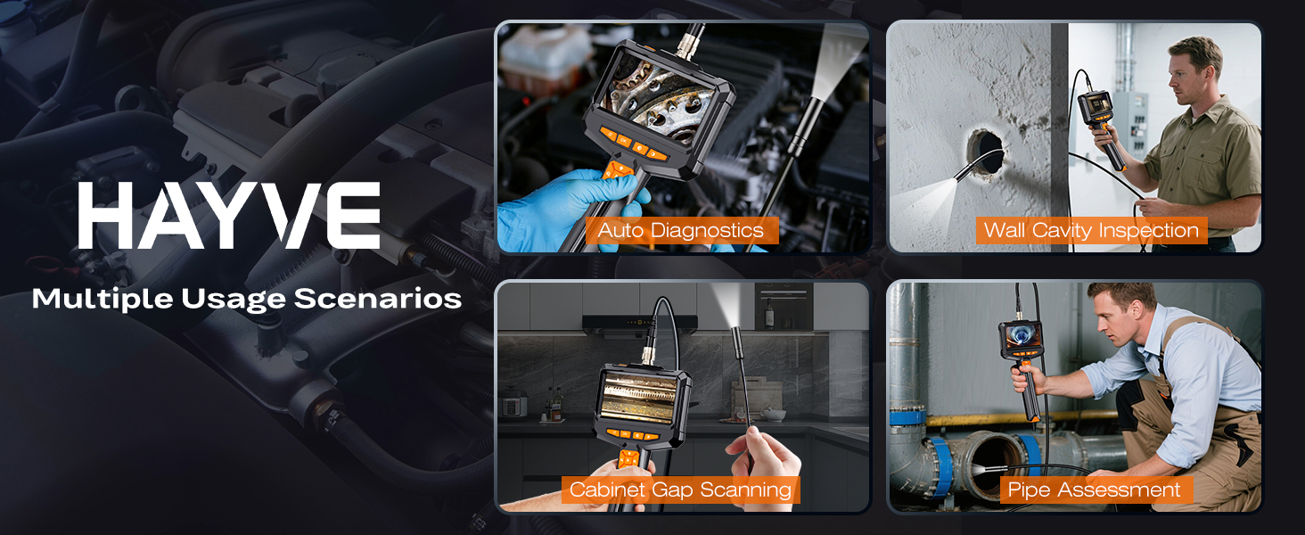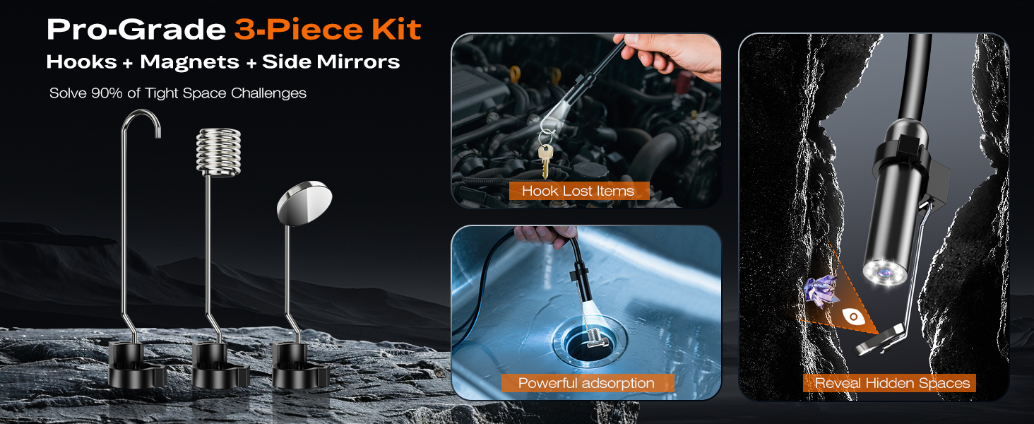 【IP67 Waterproof Inspection Camera】 This one comes with a 5-metre semi-rigid cable that's strong but bends easily to snake into tight spaces. With its IP67 waterproof rating, it'll keep working perfectly in wet and rough conditions – whatever you throw at it! Ideal for mechanics and all sorts of jobs: from cars and plumbing to electrical and HVAC checks.