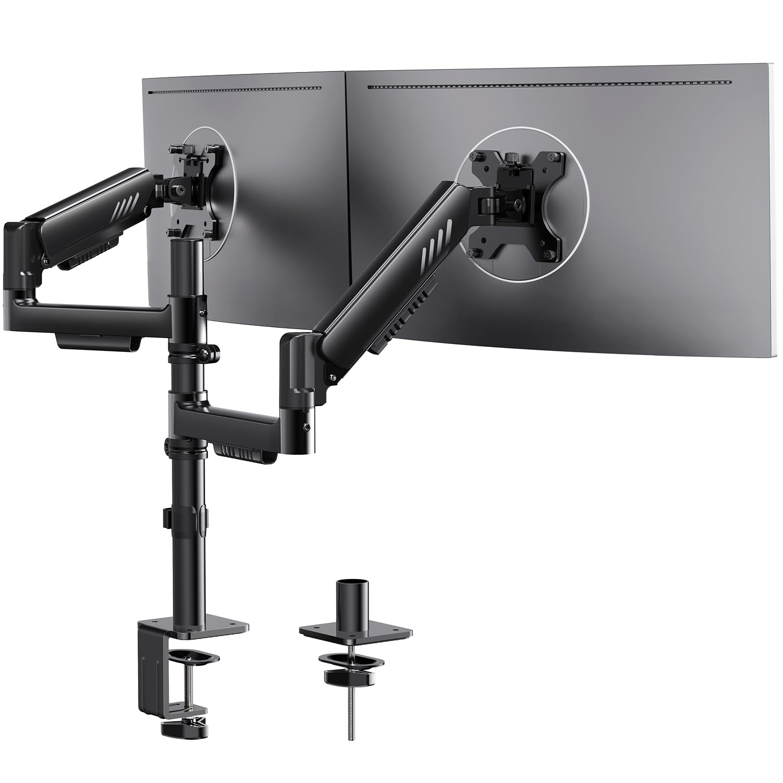 - Improved Stability and Support: Featuring an upgraded C-clamp with anti-slip silicone padding, this dual monitor mount provides a firm and secure hold. The wider VESA plate (40% larger) and the gap-free arm/post connection effectively prevent wobbling, sagging, and screen instability, offering a smooth and stable setup for your monitors.