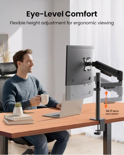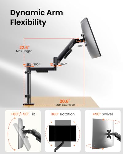• Extended Adjustability: With an additional column, this single monitor arm allows for impressive height adjustments up to 57.5cm and horizontal extension up to 52.5cm. Tilt your monitor -80° to +50°, swivel it ±90° and rotate it 360° to find the perfect position. Even in portrait mode, the desk monitor mount allows 360° free rotation, ensuring your monitor aligns with eye level for optimal viewing angles and better ergonomics.