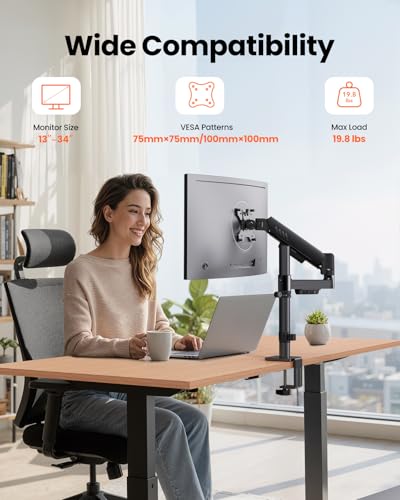 • Wide Compatibility: This monitor arm supports a wide range of monitors from 13″ to 34″, with VESA 75x75mm and 100x100mm mounting patterns. The monitor mount is capable of holding up to 9kg, making the VESA monitor mount ideal for most standard-sized displays.