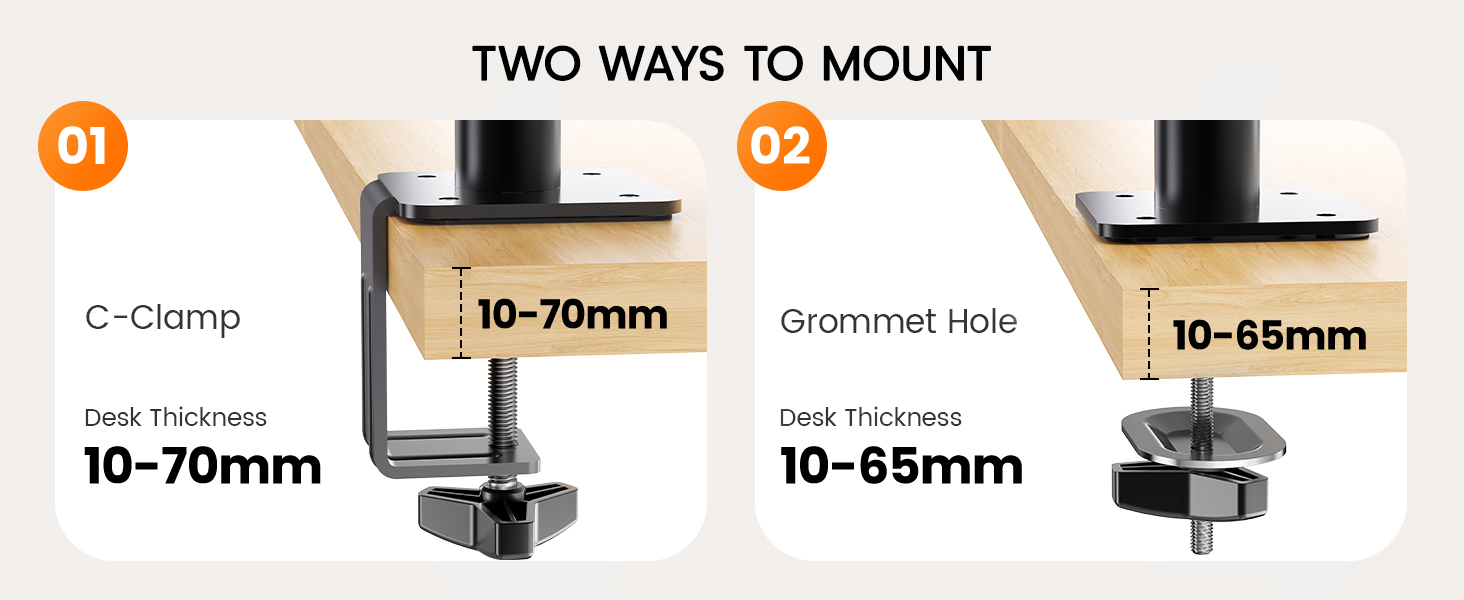 • Easy Installation: Forget about complicated setups! This monitor desk mount features an integrated C-clamp and VESA plate screws that can be easily tightened by hand, ensuring a quick and hassle-free installation process without the need for additional tools.