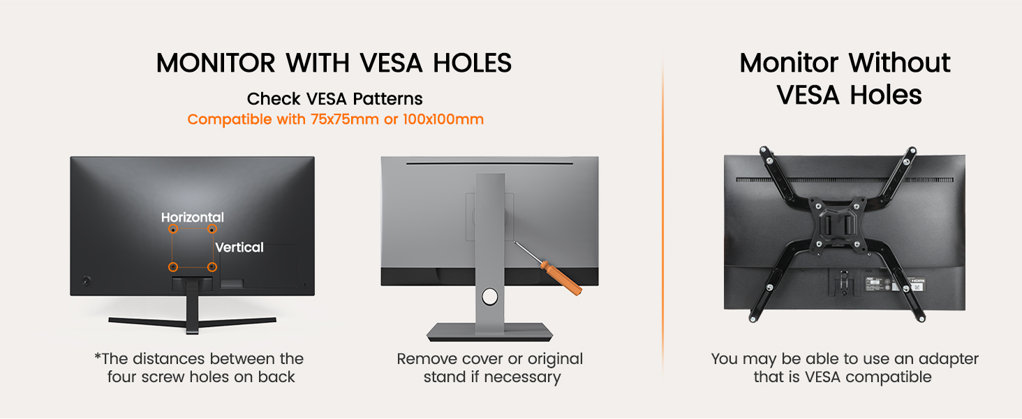 1 Check Monitor Size&Weight 2 Check Vesa Pattern 3 Check Desk Thickness