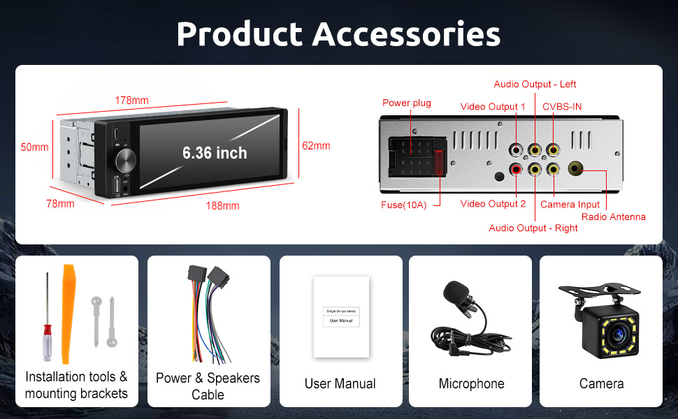 - 【Auto-Activate Reverse Camera Display】When connected to a rearview camera, the 6.36-inch screen automatically shows reverse footage once you shift to reverse gear, no manual switching is needed, significantly enhancing parking and reversing safety. (Note: This product does not include a rearview camera.)