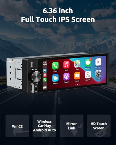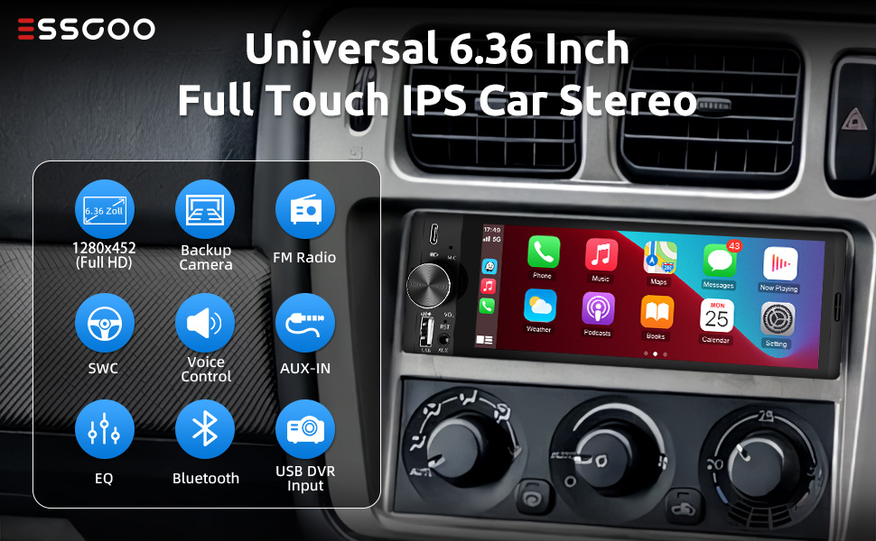 ESSGOO Single Din Car Radio with Wireless Carplay and Android Auto, 6.36 inch HD IPS bildschirm Auto Display Bluetooth Head Unit Stereo with Reverse Camera, Voice Control, Mirror Link, FM, Type-C