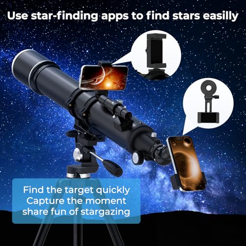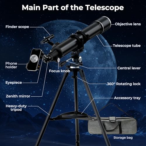 - 【Capture & Share with Phone Adapter & Complete Starter Kit】Document and share your discoveries effortlessly. The included smartphone adapter allows you to attach your phone securely for astrophotography—capture photos and videos of the Moon, planets, and scenery. The kit comes ready with everything you need: finderscope, zenith mirror, eyepieces, tripod, and a convenient carry bag for all-in-one portability.